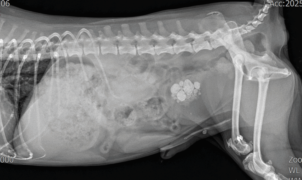 응급 진료 후 방사선(X-ray) 촬영을 진행한 결과, 요도 내에 결석이 걸려 있는 것이 확인되었으며 방광 내부에도 다량의 결석이 존재했습니다.