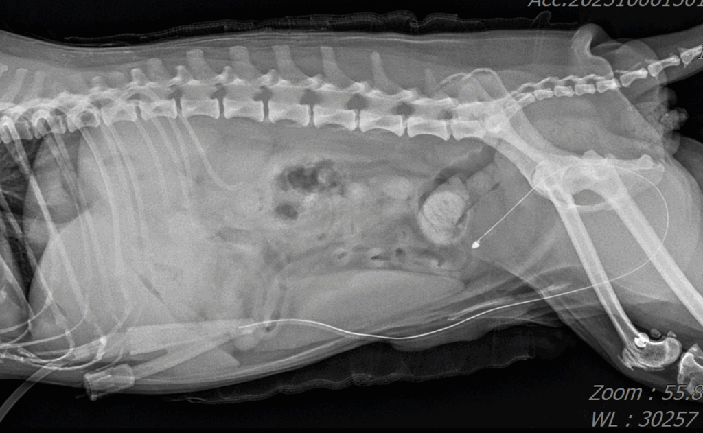 수술 후 방사선 재촬영 결과, 결석이 완전히 제거되어 방광이 깨끗하게 비워진 상태로 확인되었습니다. 환자는 출혈이나 합병증 없이 안정적으로 회복되었으며, 수액치료와 통증 관리 후 무사히 퇴원했습니다.