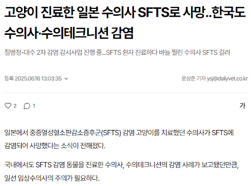 - 또 다른 사례에서는 SFTS 감염 고양이를 치료하던 수의사가 감염되어 사망한 사건도 있었습니다.